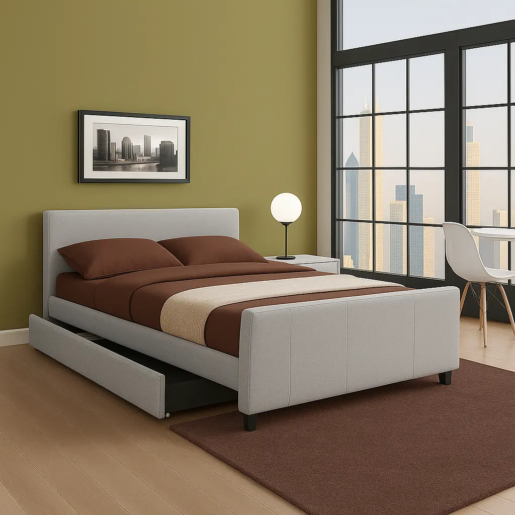 Combine Style with Storage with the Davina Prime Storage Bed at Asghar Furniture. The bed features a minimalistic design. Crafted with high quality solid wood frame and upholstered with faux leather by default to create a classy statement in your bedroom. Davina Prime Storage Bed as the name suggests come’s with 2 built-in wide drawers that provide you great amount of storage.