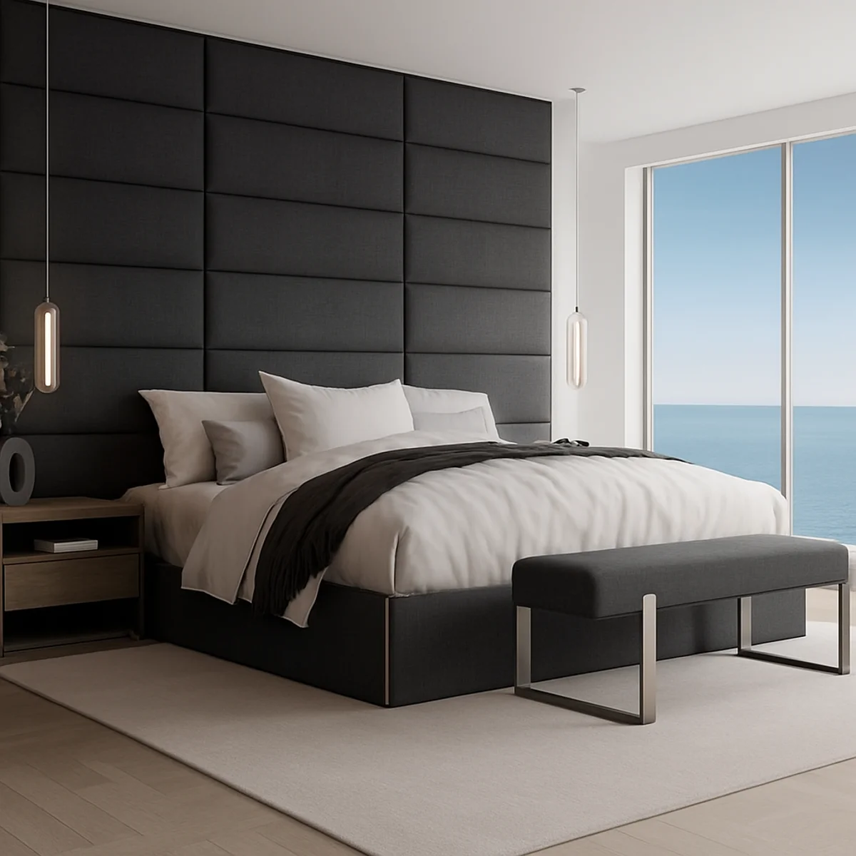 Elevate your bedroom with the VestonPanel Bed, featuring a grand floor-to-ceiling upholstered headboard that delivers a refined, luxury hotel aesthetic. Designed with premium padded panels and a sleek modern frame, this bed enhances comfort while adding architectural depth to contemporary interiors. Perfect for Dubai homes seeking a stylish, statement-making centerpiece with a high-end designer look.