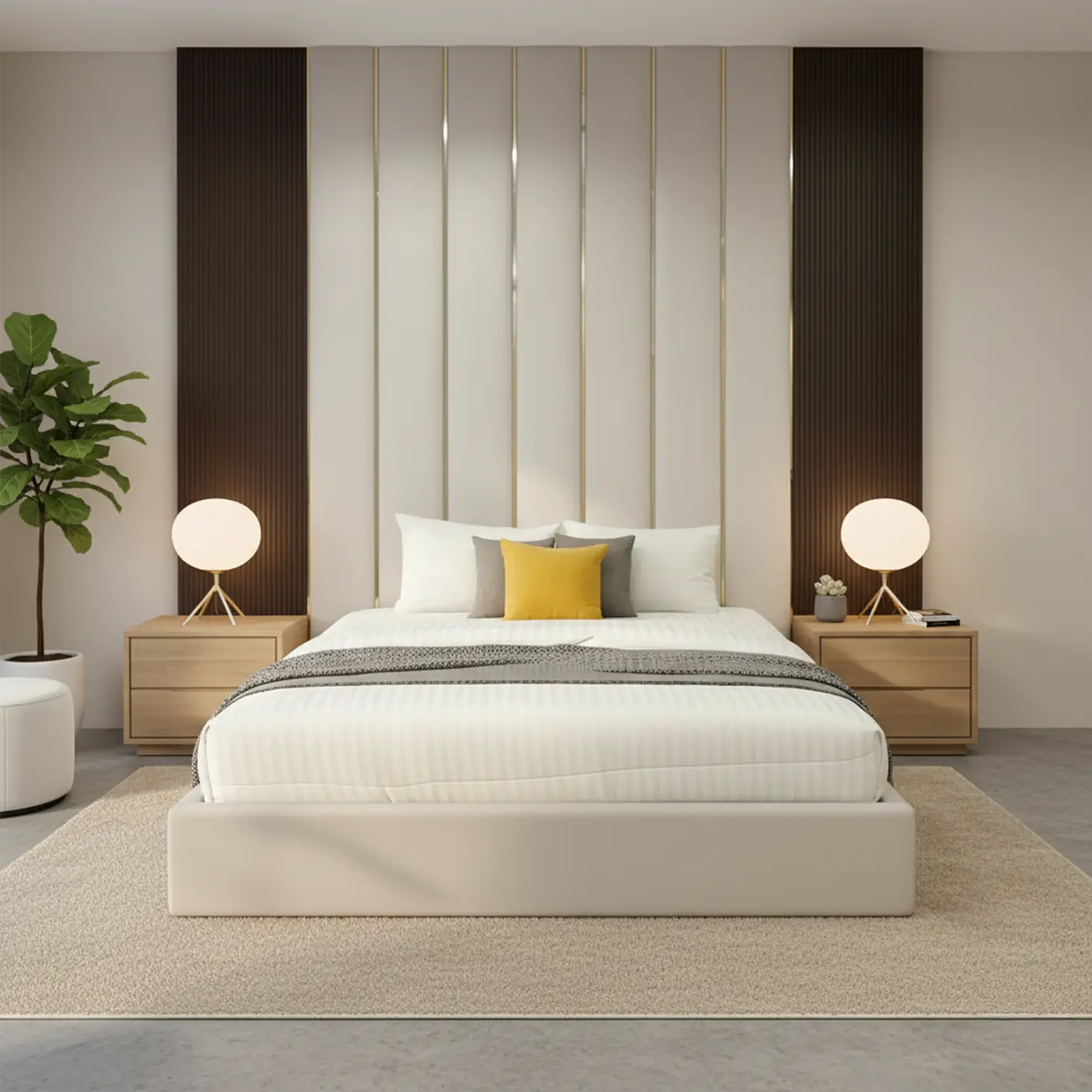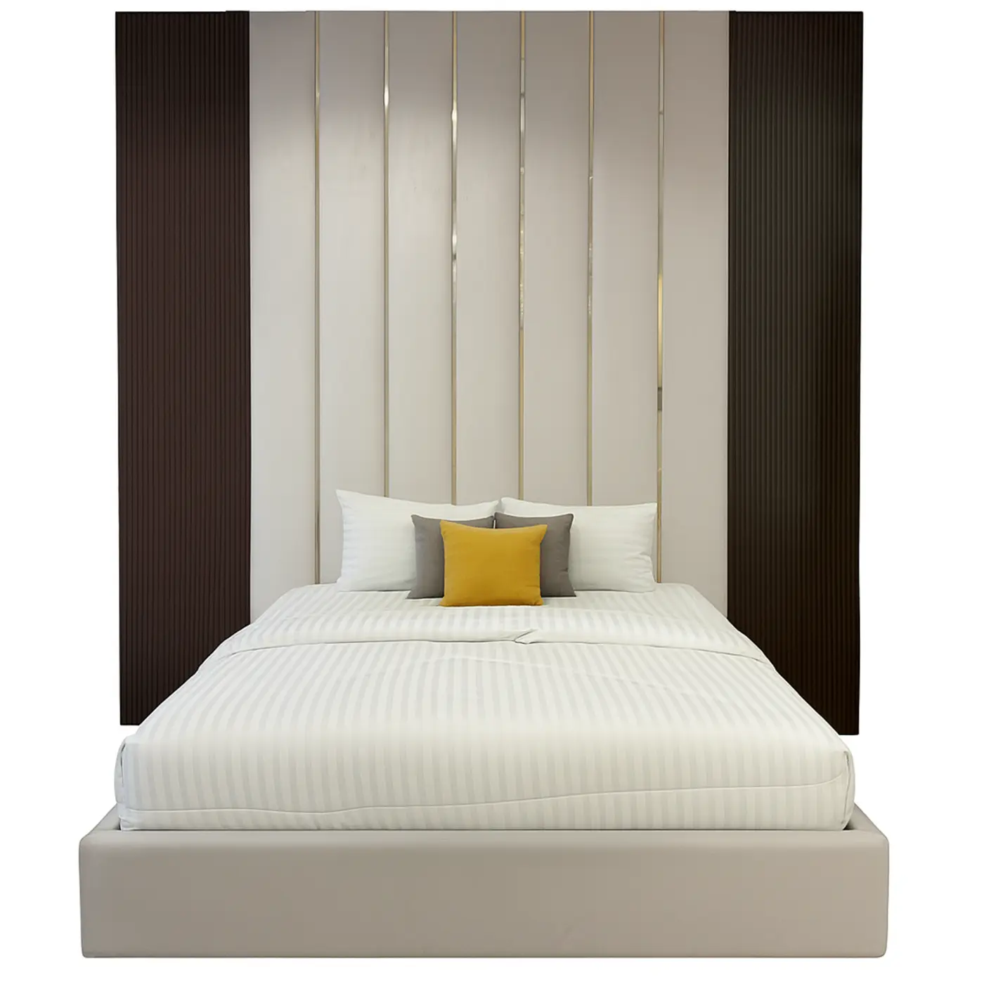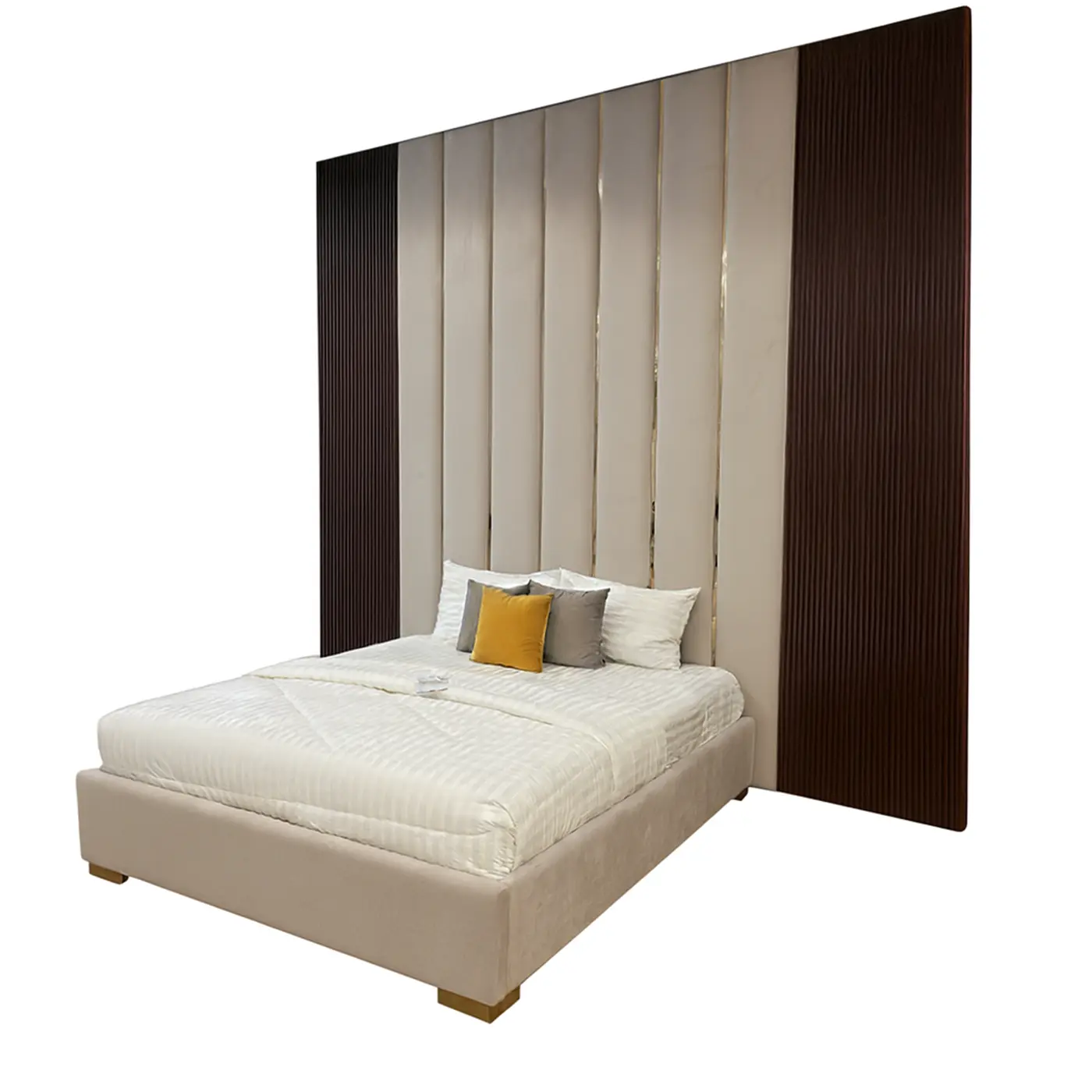 The Serenova Panel Headboard features an elegant vertical channeled headboard with integrated silver/golden detailing that adds dimension and refined contrast. Upholstered in soft ivory tones, the bed offers a clean, tailored look that radiates warmth under natural or ambient lighting.