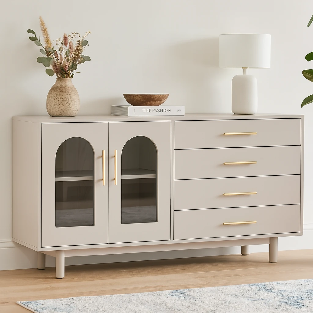The Arco Sideboard is a study in modern elegance — featuring four spacious drawers, two arched glass-front cabinets, and sleek gold handles that elevate its muted matte finish. Its balanced design offers ample storage while maintaining a light, airy presence. Perfect for dining rooms, living spaces, or even bedrooms, Arco adds timeless charm with contemporary edge.