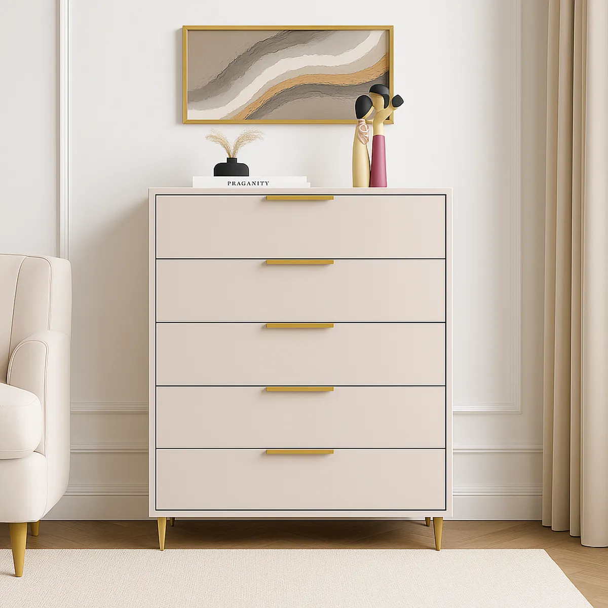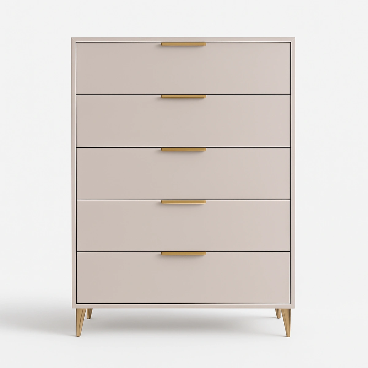 The LuxeTrim Chest showcases a modern matte finish paired with slim gold handles, creating a refined, high-end look for contemporary interiors. Its five spacious drawers offer organized storage for clothing and essentials while maintaining a sleek, minimalist profile that elevates any bedroom space.