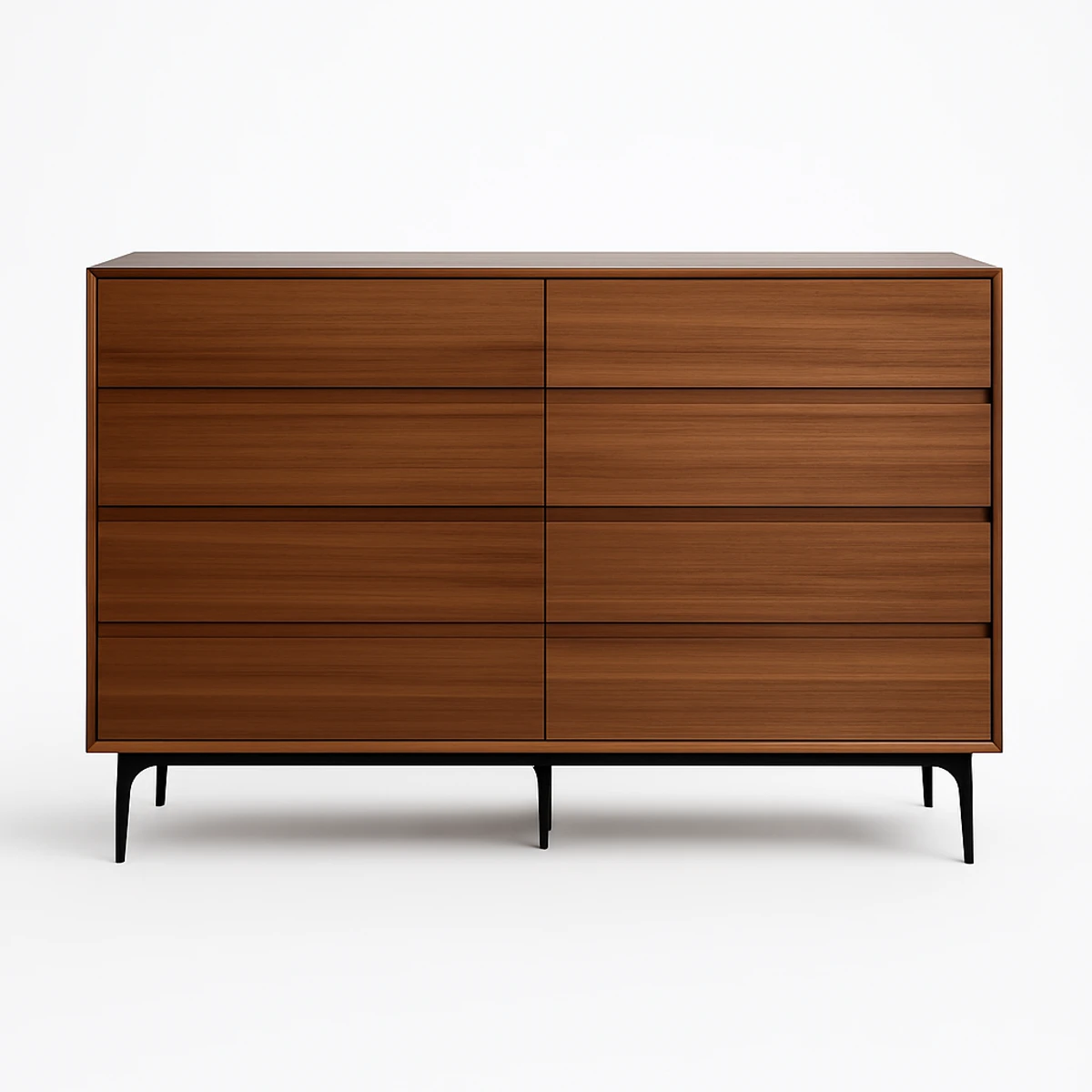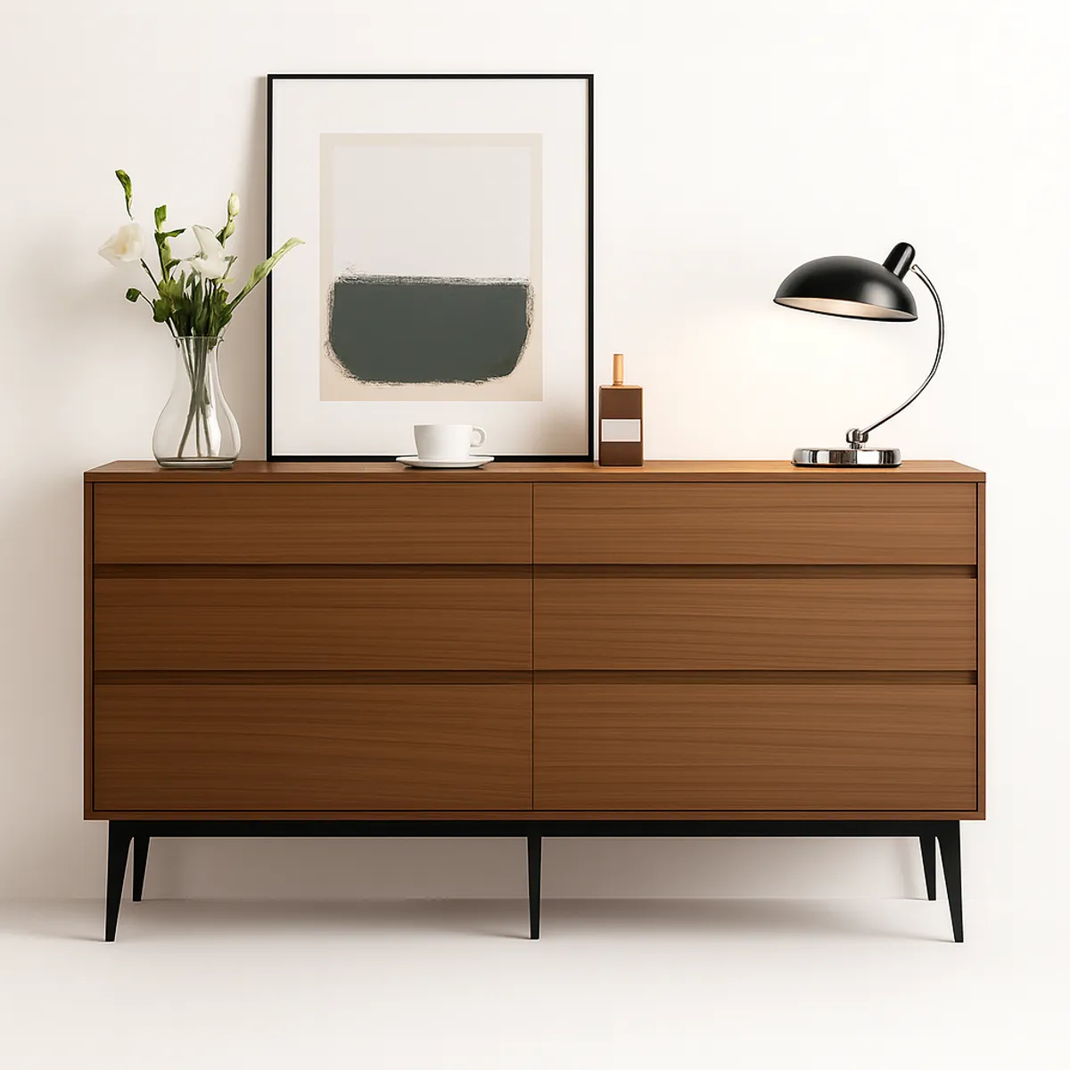 The MerrowWood Chest blends modern minimalism with warm walnut textures, offering six spacious drawers for effortless bedroom organization. Its clean lines, elevated metal legs, and smooth front panels create a sleek, contemporary silhouette that enhances any interior.