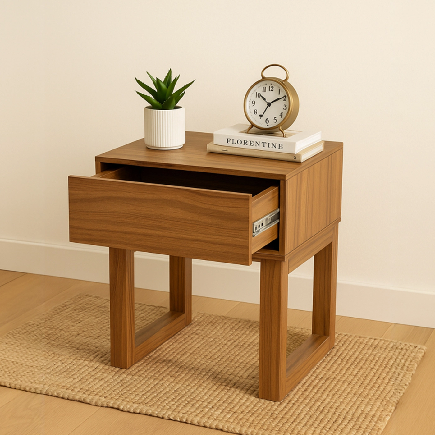 The Modulo Side Table is a modern blend of form and function, featuring a distinctive geometric leg design and a rich walnut wood finish. With a smooth-glide drawer for discreet storage, this compact piece works perfectly as a bedside table or living room accent. Clean lines and a minimalist profile make it a striking yet versatile addition to contemporary interiors.
