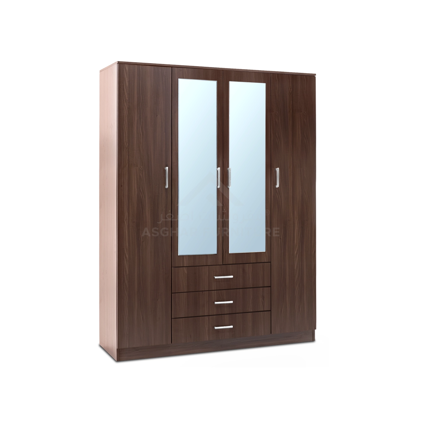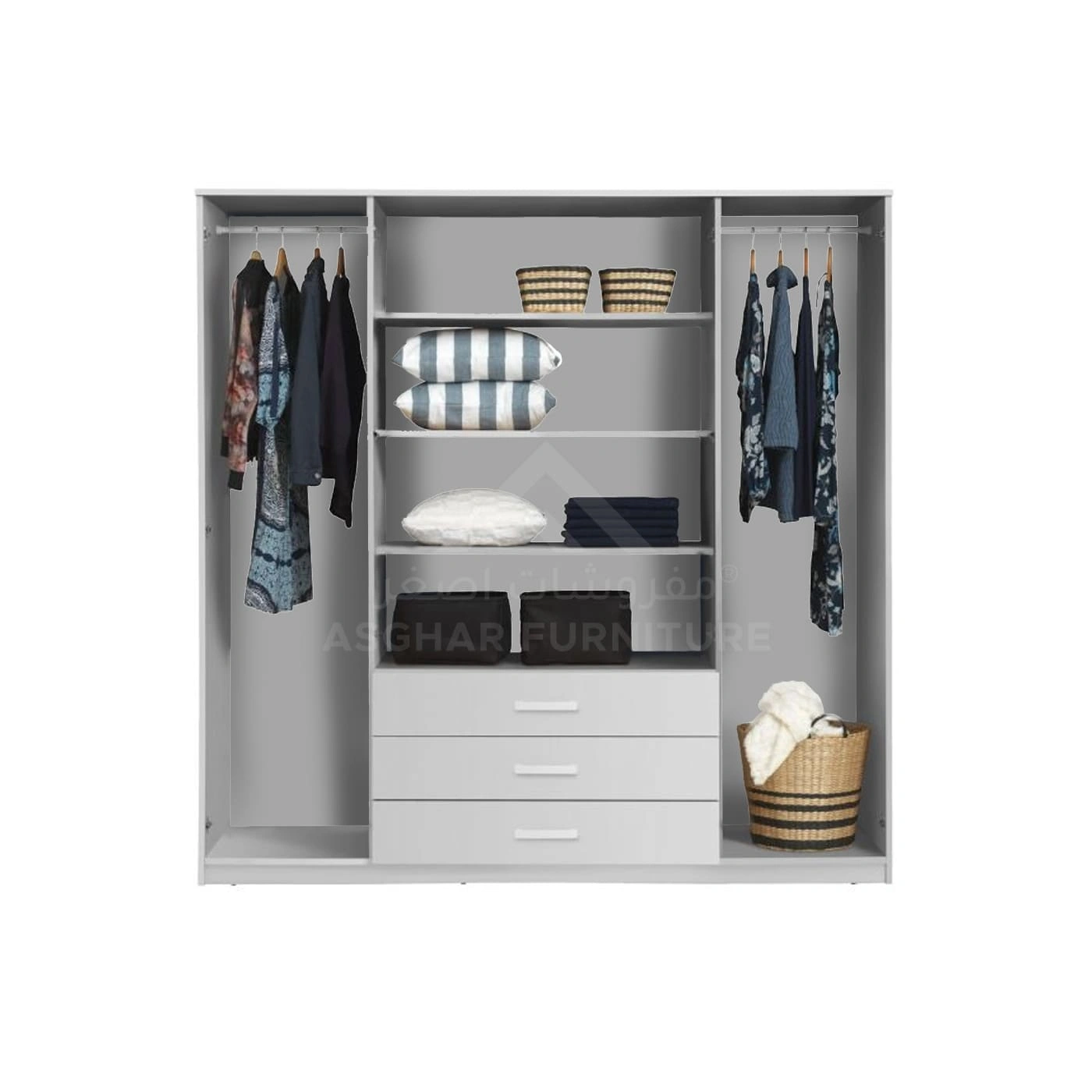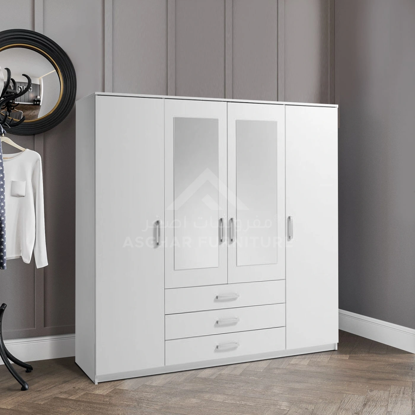 Say goodbye to everything that clutters your bedroom with the Dulab Mirror Wardrobe, ingeniously crafted by Asghar Furniture. This white wardrobe offers ample hanging space for clothes, multiple shelves, and three large, silky-sliding drawers designed to keep your room neat and organized.
