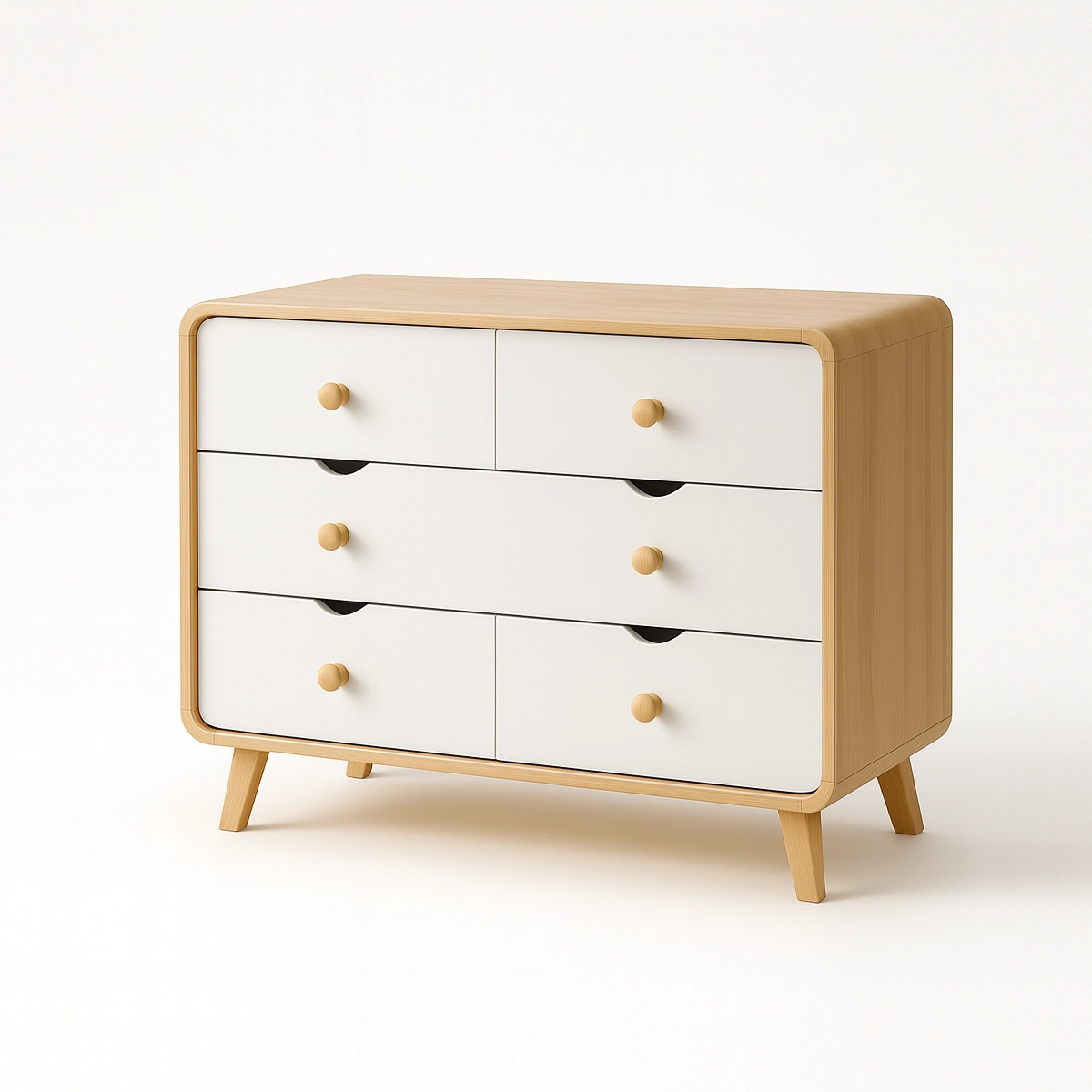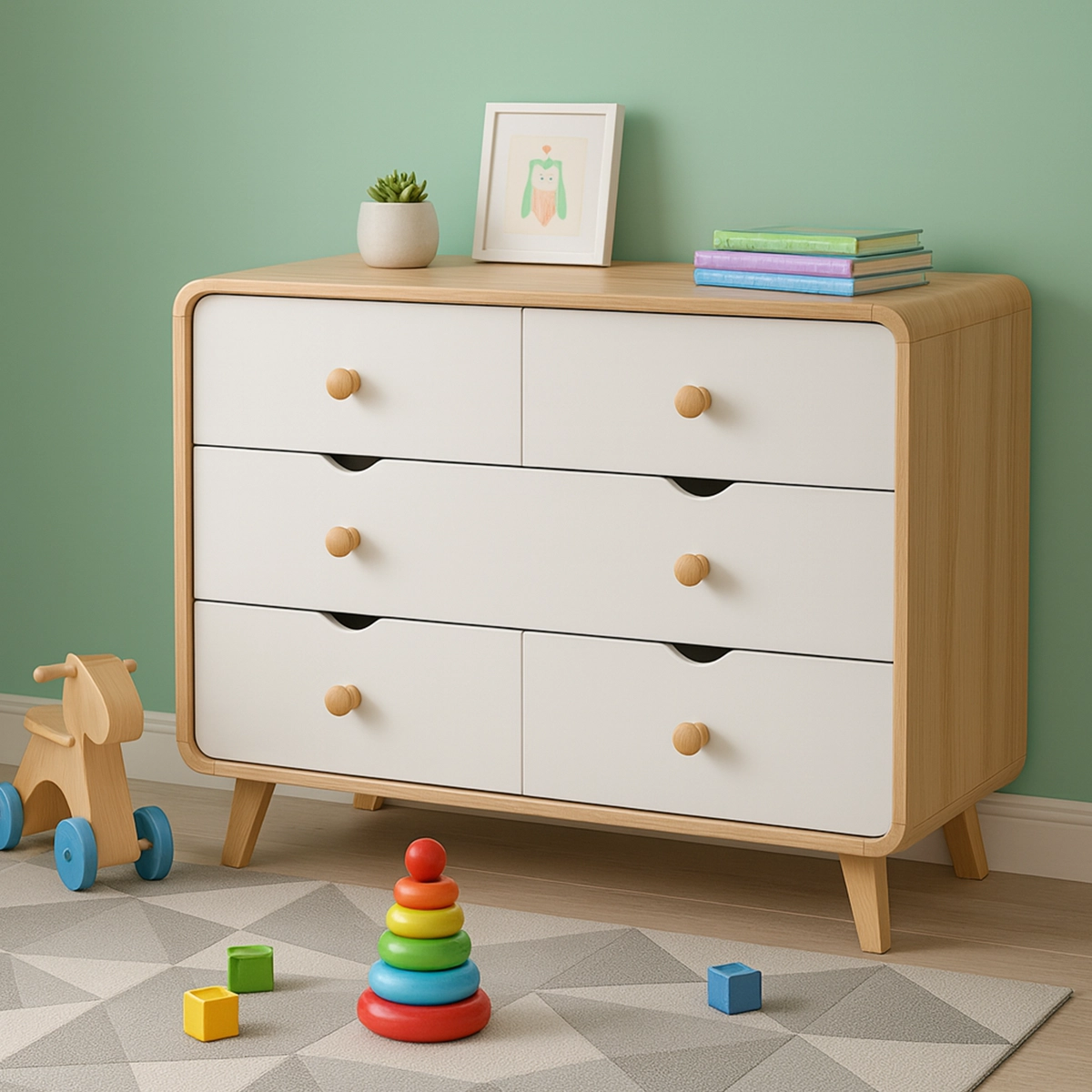 The MiniLoom Chest of Drawers features a modern curved design and a warm oak-and-white finish, offering six spacious drawers for organized kid’s storage. Its durable, child-safe construction makes it an ideal dresser for keeping clothing, toys, and essentials neatly arranged in any contemporary kid’s bedroom.