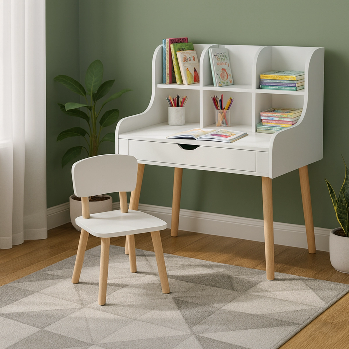 The StudyNest Mini Desk offers a compact, kid-friendly workstation designed for reading, drawing, and early learning. With built-in upper shelves and a smooth pull-out drawer, it keeps books, stationery, and essentials neatly organized. The rounded edges and natural wood legs create a modern, Scandinavian look, while its sturdy, child-safe design ensures long-lasting use in any kid’s study or play area.