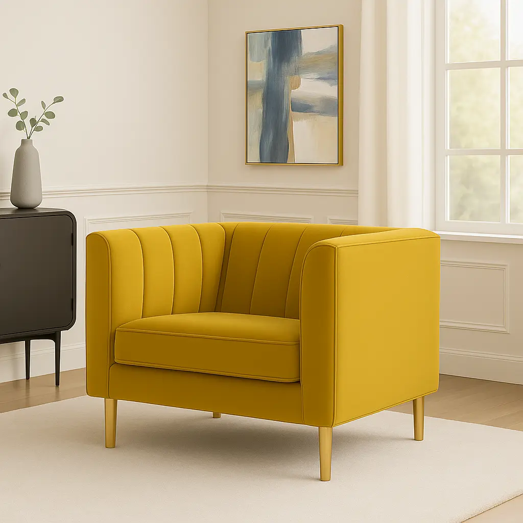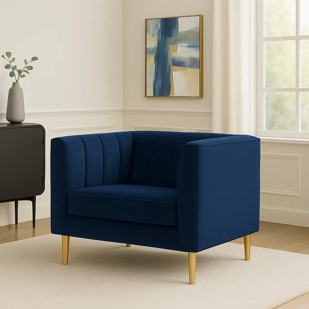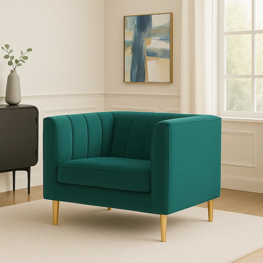 Dove Velvet Armchair, Add an extra seating option to your home with this Dove velvet accent chair. the square frame gives a fresh, contemporary feel to Dive’s mid-century influence. Notice this armchair’s slim, curved arms and tapered metal legs too.
