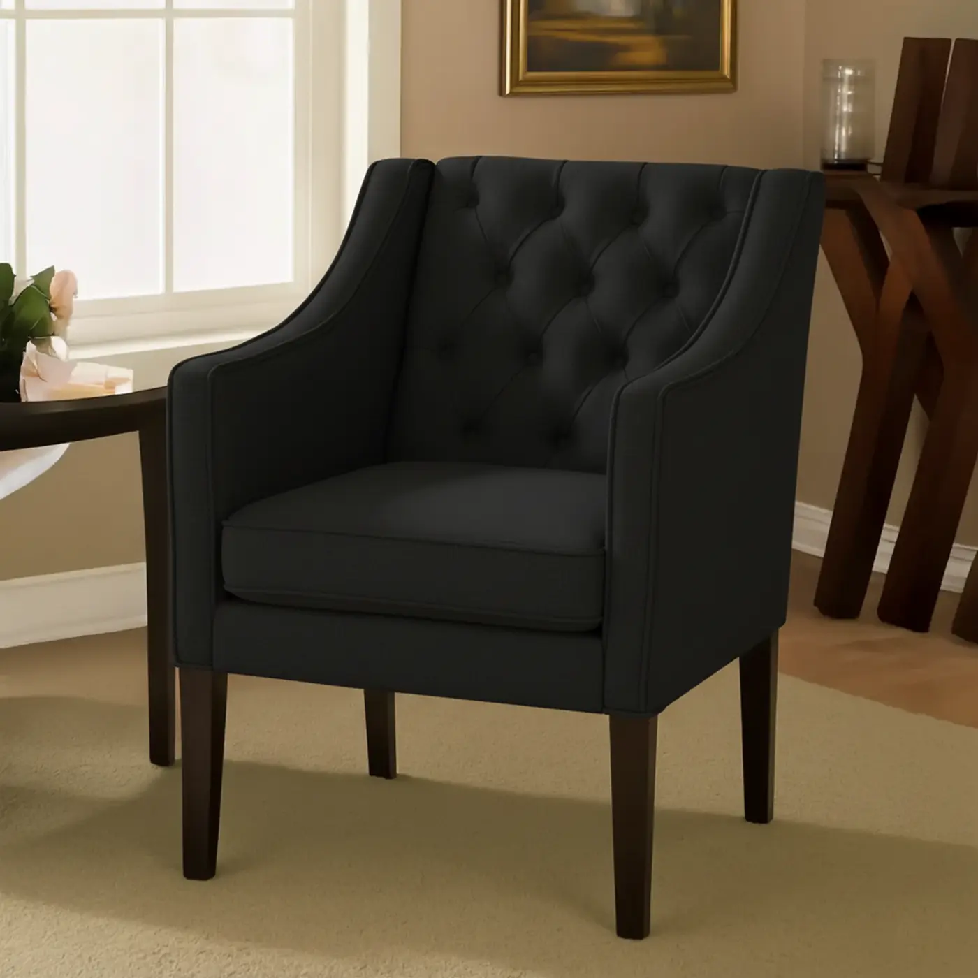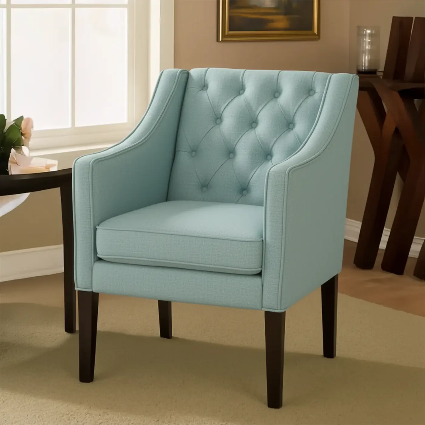 With its modest, compact size and chic elegance, Gloria Premium Button-tufted Chair has a place in any area of your home. The curved back with tufting introduces a retro design to your home while supporting your back for hours of comfortable seating, whether you’re lounging to watch a movie on your phone or just chilling to contemplate the beauty of life. A great design by Asghar Furniture.