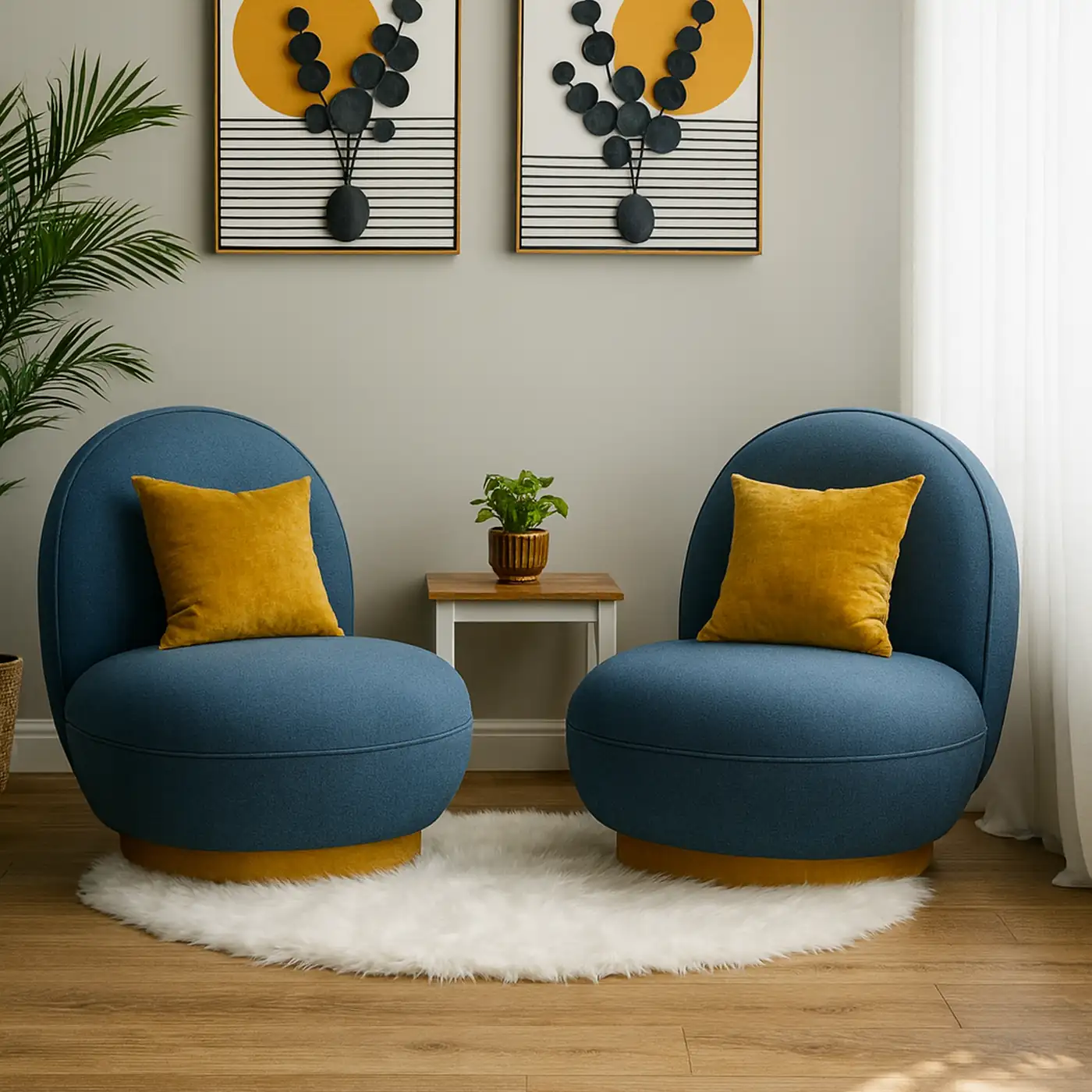 The Melo Accent Chairs from Asghar Furniture bring a perfect balance of charm and comfort to your living space. Featuring a gracefully curved silhouette, plush foam cushioning, and premium upholstery, these chairs offer both visual appeal and lasting durability. The swivel base adds functionality, while the vibrant contrast cushions lend a touch of modern flair. Whether styled as a pair in your lounge or as standalone statement pieces, Melo is designed to make every seat the best in the house.