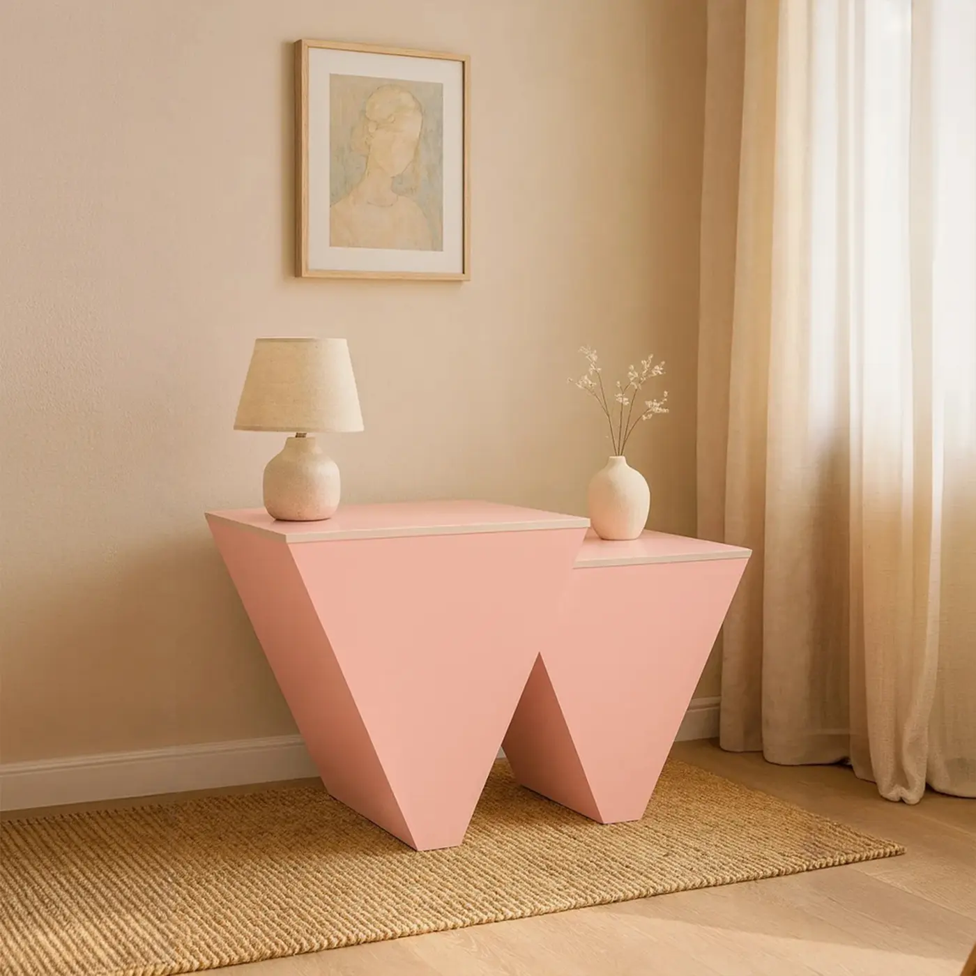 The Isla Pair features two sculptural side tables in a soft blush tone, designed to function as versatile accents or as a cohesive duo. With their clean trapezoidal shape and smooth matte finish, they lend a modern, artistic edge to any room. Style them with your favorite decor pieces or let their form speak for itself, perfect beside a lounge chair, bed, or in an entryway. Compact, elegant, and endlessly adaptable, the Isla Pair is where function meets form.