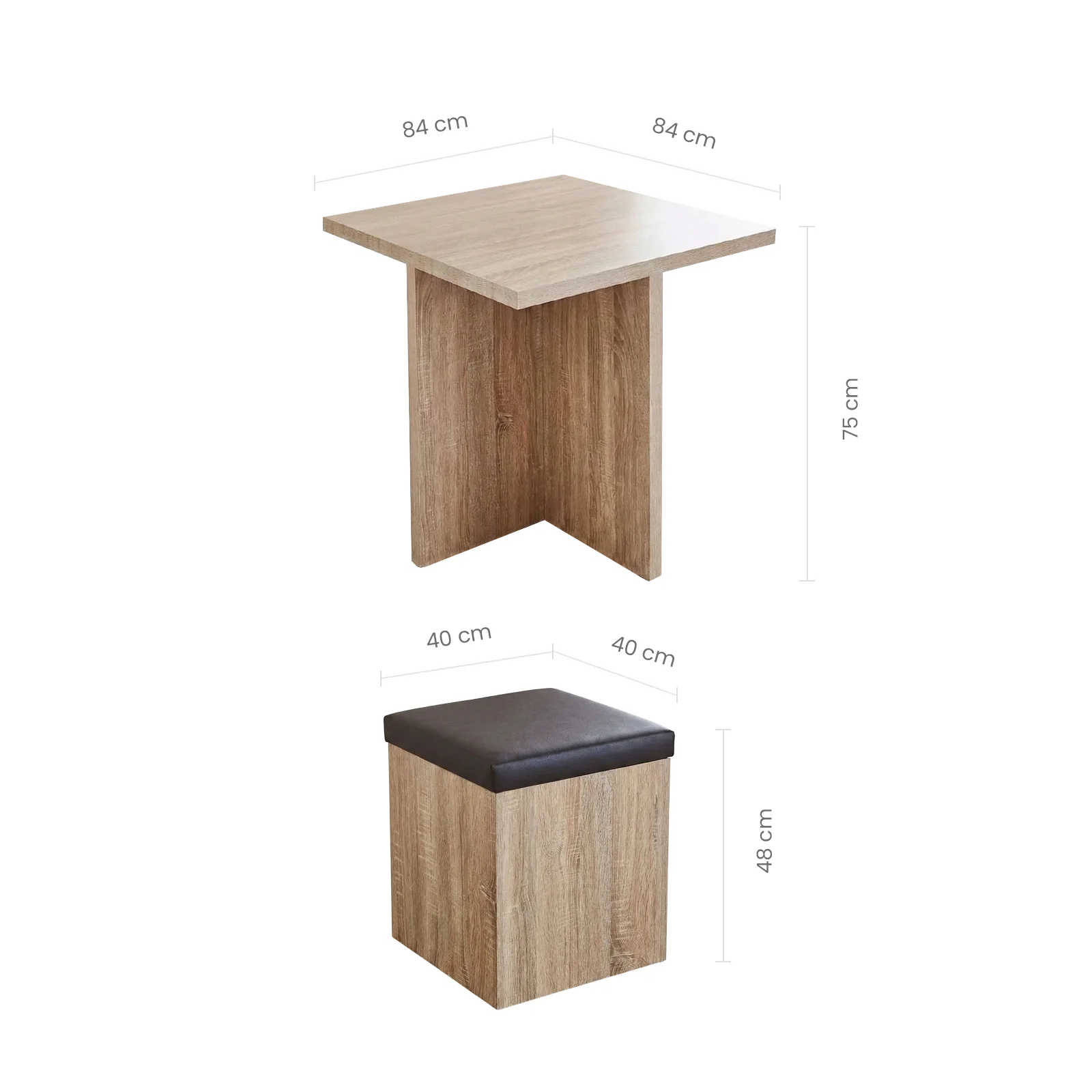 The CuboNest Dining Set brings smart space-saving design to modern homes. Its cube stools tuck neatly under the table, keeping your dining area organized and open. With a natural wood finish and cushioned seats, it’s a durable, comfortable, and stylish choice for small kitchens, apartments, and studio spaces.