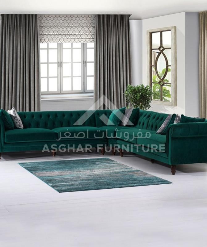 At Asghar Furniture, The modern design of the Emerson Corner Sofa makes a chic statement in any living room setting. Boasting a stunning Chesterfield inspired design, the space saving sofa is a practical and stylish addition to your home. Upholstered in smooth, luxurious velvet, the sofa features a charming deep-buttoned style complemented by elegant scrolled armrests.